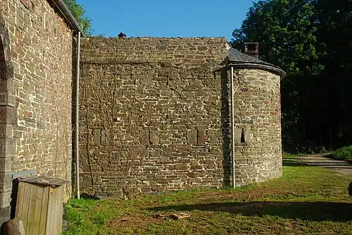 De là, le mur d'enceinte plonge vers le sud-ouest sur quelques centaines de mètres, puis tourne à angle droit vers le sud pour s'enfoncer dans les bois près d'une petite chapelle. Après une centaine de mètres en direction du sud, le mur oblique vers l'est pour descendre vers la vallée et rejoindre la Thyle et la route moderne, où il s'interrompt.