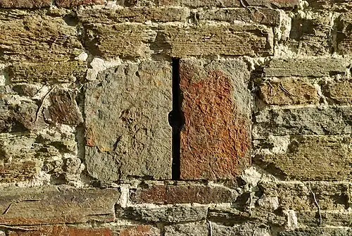 À droite de la porte, un bâtiment annexe disposé perpendiculairement est percé de quatre meurtrières, qui permettaient d'assurer la défense de la porte latéralement. Chaque meurtrière est constituée de deux dalles de schiste séparées par une fente dotée d'une entaille circulaire.