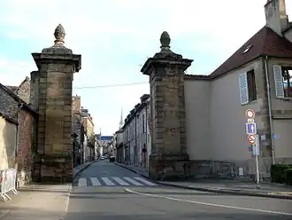 Jacques de Flesselles, intendant de la généralité de Moulins, décide néanmoins la création d'une porte symbolique pour marquer l'entrée de la ville[1] avec l'édification de deux colonnes de pierre de chaque côté de la route de Paris. Les travaux débutent en juillet 1764[1],[Note 2] et s'achèvent l'année suivante, dirigés par le maçon Martin[1]. La rue de Paris est alors une des plus importantes voies de Moulins[3], des auberges et des couvents s'y sont installés mais aussi des nobles qui y ont fait construire leur hôtel particulier[3] comme l'hôtel Héron et dont une partie est accolée à la colonne Est de la porte de Paris. C'est la maison natale du maréchal de Villars[Note 3] (1653-1734).