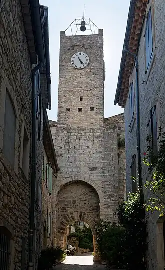 Cette porte de ville est située « rue de l’Horloge » sur la commune de Vézénobres, dans le département français du Gard.