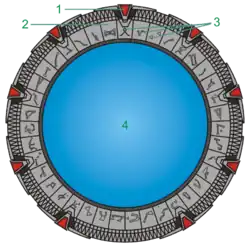 La porte des étoiles présente dans le Stargate Command, a la forme d'un grand anneau extérieur d'environ 6,70 m de diamètre, dans lequel est imbriqué un deuxième anneau, rotatif, sur lequel sont gravés 39 symboles.