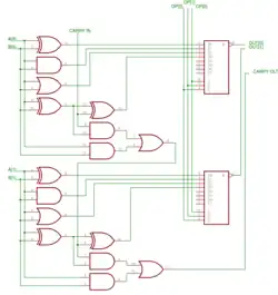 Les entrées A et B sont envoyés sur les quatre portes logiques à gauche du diagramme : de haut en bas, on reconnaît les portes XOR, AND, OR et XOR. Cette dernière porte forme l'étage d'entrée d'un circuit additionneur.