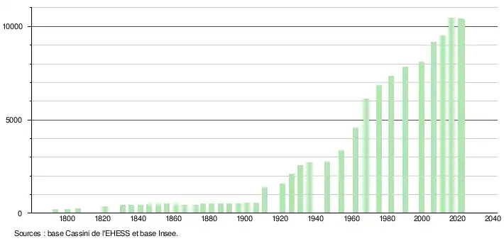 - ↑ Par convention dans Wikipédia, le principe a été retenu de n’afficher dans le tableau des recensements et le graphique, pour les populations de référence postérieures à 1999, que les populations correspondant à une enquête exhaustive de recensement pour les communes de moins de 10 000 habitants, et que les populations des années 2006, 2011, 2016, etc. pour les communes de plus de 10 000 habitants, ainsi que la dernière population de référence publiée par l’Insee pour l'ensemble des communes.