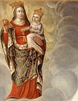 Le tableau est orné, en partie supérieure, de nuées dans lesquelles apparaissent, de gauche à droite, une Vierge à l’Enfant représentant Notre-Dame-de-Benoite-Vaux, tous deux auréolés et couronnés. Au centre des nuages, trois angelots tendent vers l’Amazone chrétienne un livre traduisant l’érudition littéraire et musicale de celle qui écrivait des tragédies religieuses, une couronne de fleurs, symbole de piété mariale, et une couronne de laurier qui évoque la victoire de cette dernière sur les troupes suédoises et croates. Enfin, à droite, une Victoire proclame au son des trompettes la gloire militaire de la Dame de Saint-Baslemont.