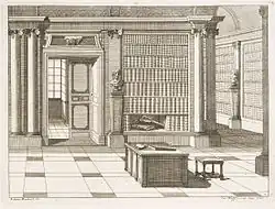 Ce type de vue apparaît dès la fin du XVIIe siècle. Il s'agit alors essentiellement d'une représentation descriptive : souvent fruit d'une commande, elle montre le contenu d'un cabinet de curiosités, d'une galerie de peintures ou d'une bibliothèque d'amateur. Un des premiers exemples connus concerne la bibliothèque de Samuel Pepys à Londres en 1693[1]. L'intention de l'époque est avant tout documentaire, c'est ce qui fait leur intérêt pour les chercheurs et décorateurs d'aujourd'hui : on voit comment, au XVIIe siècle, un érudit conserve ses livres sous bibliothèque vitrée (une innovation pour l'époque), utilise un pupitre de lecture, installe des coussins pour son confort, accroche un plan de Paris au mur, etc.