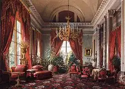 La reine Victoria fut friande de ces représentations d'intérieur. De notoriété publique amoureuse de son mari, aimant la vie de famille et les conforts de la maison[9], elle fit représenter la quasi-totalité des pièces de ses palais et châteaux[10]. Mais toute l'Europe, de l'Italie à la Suède, et de la France à la Pologne, s'enticha également de l'exercice, l'acmé étant atteinte en Russie où les tsars feront représenter l'ensemble de leurs intérieurs. Possesseurs de nombreux palais - palais d'Hiver, Tsarkoïe Selo, Gatchina, Peterhof, Pavlovsk... - et chaque palais comptant plusieurs centaines de pièces, Nicolas Ier, Alexandre II, Alexandre III commandent tous des aquarelles. Il arrive même que, le décor changeant, des salons ou galeries sont représentés à plusieurs reprises et ce, sous un même règne. Ces feuilles sont aujourd'hui considérées par certains comme les plus belles et les mieux exécutées du monde[11].