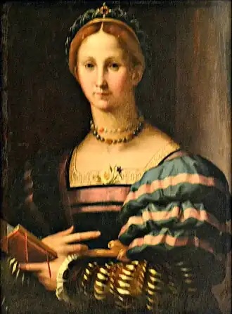 La femme est représentée portant des vêtements typiques de la Florence du XVIe siècle, représentée à partir de la taille, regardant vers le spectateur et tenant un livre ouvert dans sa main droite. Les manches bouffantes sont riches en éléments décoratifs[2]. D'autres éléments de détail se trouvent à la taille, où se trouve une ceinture en tissu, au cou où se trouve un collier de perles, qui témoigne du statut social et économique confortable de la personne représentée[1] et sur la tête, où « c'est un fermoir précieux qui maintient le bonnet en filet tressé sur la coiffure en forme d'anneau des cheveux de la dame, typique de la mode du XVe siècle et de la première moitié du XVIe siècle[2].
