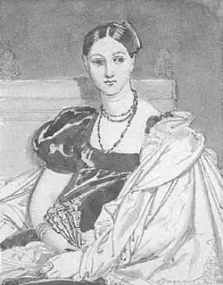 Ce portrait est marqué par l'influence de Raphaël (La Fornarina, palais Barberini). Le châle, les bijoux et le précieux éventail indiquent la qualité du modèle ; le velours chatoyant de la robe rappelle le portait de Madame Rivière[2].