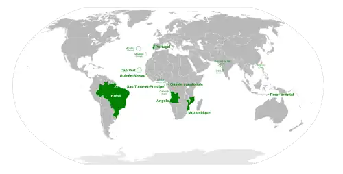 Actuellement, le portugais est langue officielle en Angola, au Brésil, au Cap-Vert, en Guinée-Bissau, en Guinée équatoriale (depuis 2011), au Mozambique, au Portugal, à Sao Tomé-et-Principe, et au Timor oriental[55]. Il est également l'une des langues officielles de la région administrative spéciale de Macao (avec le chinois).