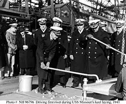La première étape de l'histoire d'un navire est généralement une simple cérémonie marquant la pose de la quille. Les invitations à la cérémonie sont émises par les responsables du chantier naval, et ils conduisent la cérémonie. Le constructeur peut être le commandant d'un chantier naval ou le président d'une entreprise privée. Le futur nom du navire, sans le "USS", est mentionné dans l'invitation, s’il est connu; sinon seul son type et son nombre sont donnés, par exemple, DD 2217[6].