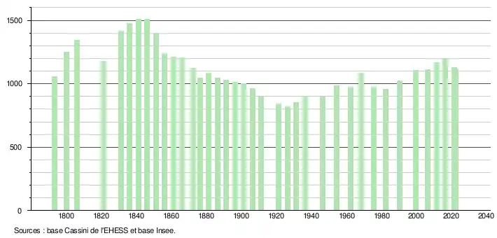 L'évolution du nombre d'habitants est connue à travers les recensements de la population effectués dans la commune depuis 1793. Pour les communes de moins de 10 000 habitants, une enquête de recensement portant sur toute la population est réalisée tous les cinq ans, les populations de référence des années intermédiaires étant quant à elles estimées par interpolation ou extrapolation[28]. Pour la commune, le premier recensement exhaustif entrant dans le cadre du nouveau dispositif a été réalisé en 2006[29].