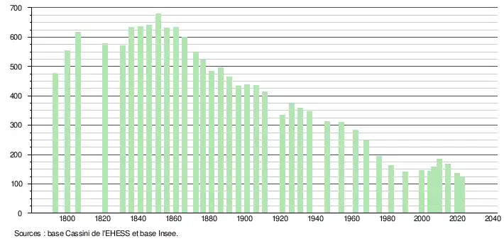 L'évolution du nombre d'habitants est connue à travers les recensements de la population effectués dans la commune depuis 1793. Pour les communes de moins de 10 000 habitants, une enquête de recensement portant sur toute la population est réalisée tous les cinq ans, les populations de référence des années intermédiaires étant quant à elles estimées par interpolation ou extrapolation[29]. Pour la commune, le premier recensement exhaustif entrant dans le cadre du nouveau dispositif a été réalisé en 2004[30].
