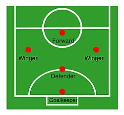 - 1-2-1 : positionnement de base où le défenseur, les deux ailiers et le pivot sont facilement identifiables par leur placement en losange ;