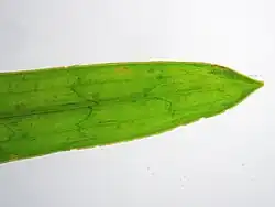 Ce sont des plantes annuelles submergées dans l'eau douce, sans rhizome. Les tiges sont densément ramifiées, les entre-nœuds légèrement à fortement comprimés, larges de 1,2 à 3,5 mm ; il n'y a pas de glandes nodales ; les turions sont axillaires ou terminaux, raccourcis en forme de pousses, feuillus. Les stipules sont axillaires, convolutées, longues de 1 à 1,8 cm, translucides, souvent fibreuses-persistantes à l'apex. Les feuilles sont sessiles, linéaires, longues de 5 à 15 cm et larges de 2,4 à 4,8 mm, possédant entre trois et cinq nervures avec 12 à 32 sclérenchymes faibles mais visibles, avec des rangées étroites de lacunes bordant la nervure médiane, la base étroitement cunéiforme, l'apex subaigu à arrondi et mucroné[1].