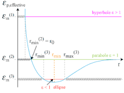 - pour , on trouve deux valeurs limites, l'une inférieure et l'autre supérieure : il s'agit du péricentre et de l'apocentre d'une ellipse ;
