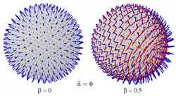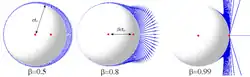 Sur les illustrations ci-contre, on observe le résultat d'un événement qui a eu lieu au centre de la sphère à une distance . Durant ce temps , la particule continue son mouvement et n'est donc plus forcement au centre de la sphère au moment de l'observation. Pour les champs engendrés par une accélération non nulle, on remarquera la symétrie axiale du champ par rapport au vecteur accélération lorsque puis la concentration des radiations dans la direction de la trajectoire lorsque [1].