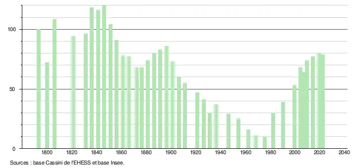 L'évolution du nombre d'habitants est connue à travers les recensements de la population effectués dans la commune depuis 1793. Pour les communes de moins de 10 000 habitants, une enquête de recensement portant sur toute la population est réalisée tous les cinq ans, les populations de référence des années intermédiaires étant quant à elles estimées par interpolation ou extrapolation[32]. Pour la commune, le premier recensement exhaustif entrant dans le cadre du nouveau dispositif a été réalisé en 2004[33].