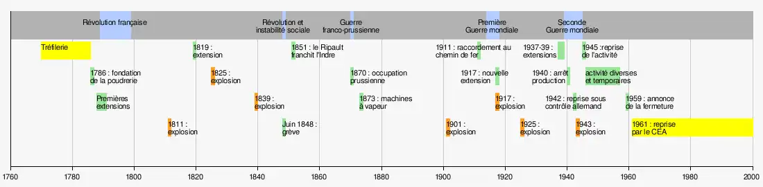Elle est créée à la veille de la Révolution en 1786 par Antoine Lavoisier, régisseur général de l'Administration royale des poudres, en remplacement d'une tréfilerie établie sur le cours de l'Indre quelques années auparavant, cette tréfilerie faisant elle-même suite à des moulins à farine mentionnés au XVIe siècle. Elle prend de l'importance tout au long du XIXe siècle et elle est considérée, dans les années 1840, comme « la plus belle poudrerie d'Europe ». Pendant la Première Guerre mondiale, elle emploie jusqu'à 6 000 ouvriers et connaît un grand développement en produisant la poudre B qui a supplanté la poudre noire. Au début de la Seconde Guerre mondiale, au maximum de son extension, ses installations s'étendent sur 120 ha.
