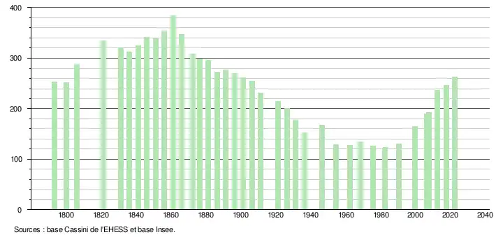 L'évolution du nombre d'habitants est connue à travers les recensements de la population effectués dans la commune depuis 1793. Pour les communes de moins de 10 000 habitants, une enquête de recensement portant sur toute la population est réalisée tous les cinq ans, les populations de référence des années intermédiaires étant quant à elles estimées par interpolation ou extrapolation[19]. Pour la commune, le premier recensement exhaustif entrant dans le cadre du nouveau dispositif a été réalisé en 2007[20].