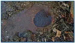 Un pouhon, source ferrugineuse et bouillonnante de gaz carbonique, sortant d'un tronc d'arbre fossilisé, juste à côté de Ferrières à Vieux-Fourneau, d'un diamètre de 40 cm environ.