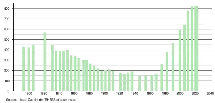 L'évolution du nombre d'habitants est connue à travers les recensements de la population effectués dans la commune depuis 1793. Pour les communes de moins de 10 000 habitants, une enquête de recensement portant sur toute la population est réalisée tous les cinq ans, les populations de référence des années intermédiaires étant quant à elles estimées par interpolation ou extrapolation[16]. Pour la commune, le premier recensement exhaustif entrant dans le cadre du nouveau dispositif a été réalisé en 2005[17].