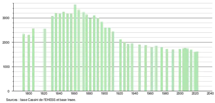 L'évolution du nombre d'habitants est connue à travers les recensements de la population effectués dans la commune depuis 1793. Pour les communes de moins de 10 000 habitants, une enquête de recensement portant sur toute la population est réalisée tous les cinq ans, les populations de référence des années intermédiaires étant quant à elles estimées par interpolation ou extrapolation[17]. Pour la commune, le premier recensement exhaustif entrant dans le cadre du nouveau dispositif a été réalisé en 2004[18].