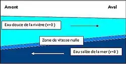 Au fil des semaines, les jeunes larves dérivent jusqu’à un estuaire, où elles pourront se nourrir et croître. Cette dérive des œufs et des larves dépend du débit. Dans le cas des rivières à frasil, la formation d’un barrage de frasil contribue aussi à la rétention des œufs et des larves. Les températures et les débits élevés peuvent causer une dérive massive des embryons et des œufs. Dans le cas du fleuve Saint-Laurent, les larves de poulamons s’accumulent dans la zone de l’extrémité est de l’Île d’Orléans, où les courants de marées remontent, entraînant une grande quantité de particules, qui rendent l’eau turbide et riche en nutriments. Afin de rester dans l’estuaire, qui constitue un lieu favorable à leur croissance, les poulamons se positionnent surtout à la profondeur à laquelle le courant est nul, c’est-à-dire entre le courant descendant de l’eau plus douce de la surface, et celui de l’eau salée du fond qui remonte vers les terres, lors des épisodes de marée (voir fig.1).
