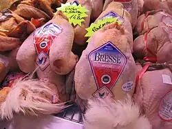 - Poularde de Bresse AOP : les chapons gras sont mentionnés en 1591 dans les registres municipaux de Bourg-en-Bresse. Selon le règlement (UE) no 1121/2013 de la commission européenne, la Poularde de Bresse est une poule femelles de race gauloise ou Bresse blanche, âgée de 140 jours minimum à maturité sexuelle (224 pour le chapon de Bresse) n’étant pas entrées en cycle de ponte, d'un poids minimum de 1,8 kg effilé. L’aire géographique de l’appellation d’origine est une zone de communes formant un ensemble continu au milieu des départements français de l'Ain, du Jura et de la Saône et Loire autour de Louhans au nord et Montrevel-en Bresse au sud[3].