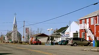 ![]() Poularies : vue du haut des airs, église et centre du village. |