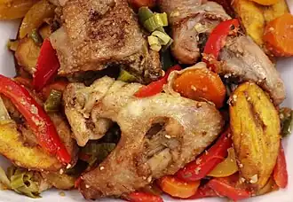Le poulet DG est un mets traditionnel de la cuisine camerounaise. C'est un ragoût de poulet frit servi avec un cocktail de frites de plantains, de légumes (carottes, poivrons, haricots verts) et de divers aromates (herbes, bouillon cube). C'est une recette simple, ne demandant que peu d'ingrédients exotiques.