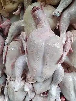 Un poulet au chlore, ou plus rarement poulet à la javel, est un poulet dont la commercialisation est caractérisée par une désinfection préalable au moyen de chlorure de sodium acidifié, de phosphate trisodique, et d'acides peroxycarboxyliques, en vue de détruire notamment les salmonelles.
