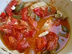 Cassole de poulet et piperade de la cuisine basque (sauce confite mijoté de piments longs et fins, dits des Landes rouge et vert, tomates, oignons, ail, huile d'olive, vin blanc, bouquet garni, poivre, et piment d'Espelette). | |