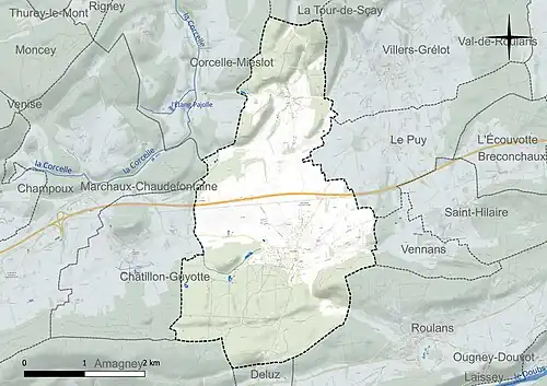 Les communes limitrophes sont Amagney, Châtillon-Guyotte, Corcelle-Mieslot, Deluz, La Tour-de-Sçay, Le Puy, Marchaux-Chaudefontaine, Roulans, Vennans et Villers-Grélot.