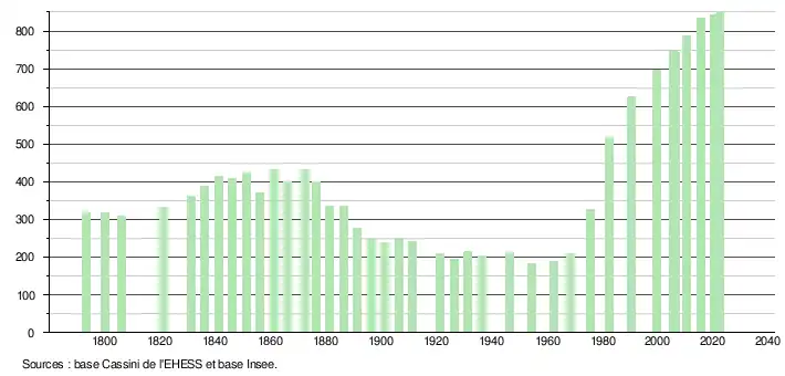 L'évolution du nombre d'habitants est connue à travers les recensements de la population effectués dans la commune depuis 1793. Pour les communes de moins de 10 000 habitants, une enquête de recensement portant sur toute la population est réalisée tous les cinq ans, les populations de référence des années intermédiaires étant quant à elles estimées par interpolation ou extrapolation[22]. Pour la commune, le premier recensement exhaustif entrant dans le cadre du nouveau dispositif a été réalisé en 2005[23].