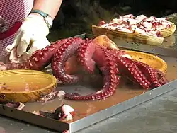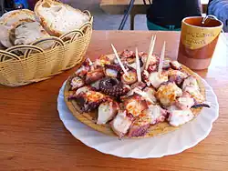 Polbo á feira, servi dans la tradition des ferias de Galice. | |