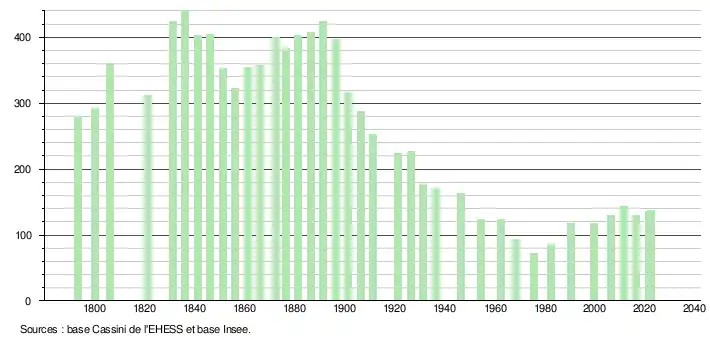 L'évolution du nombre d'habitants est connue à travers les recensements de la population effectués dans la commune depuis 1793. Pour les communes de moins de 10 000 habitants, une enquête de recensement portant sur toute la population est réalisée tous les cinq ans, les populations de référence des années intermédiaires étant quant à elles estimées par interpolation ou extrapolation[15]. Pour la commune, le premier recensement exhaustif entrant dans le cadre du nouveau dispositif a été réalisé en 2006[16].