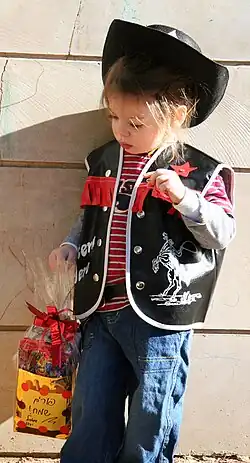 Les colis alimentaires y sont devenus des paniers chargés de victuailles et les mascarades ont pris la dimension de véritables festivals, les Adeloyada (en) (parades costumées à thème), parfois comparées au carnaval de Rio ou au Mardi Gras de la Nouvelle-Orléans. Inaugurées à Tel Aviv en 1912, elles se sont propagées à d’autres villes depuis[101],[102].