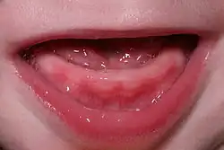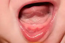 La dentition est le processus par lequel les premières dents d'un nourrisson (les dents de lait) apparaissent successivement, généralement par paires, en émergeant à travers les gencives. Les incisives centrales mandibulaires sont les premières dents primaires à faire éruption, généralement entre les âges de 6 et 10 mois[1]. Cela peut prendre plusieurs années pour que les 20 dents apparaissent et que l'éruption dentaire soit complète. Contrairement à ce que l'on pourrait croire, les dents ne coupent pas la chair lorsqu'elles émergent à travers les gencives : des hormones sont libérées dans le corps qui provoquent la mort et la séparation de certaines cellules des gencives, ce qui permet aux dents de passer[2].