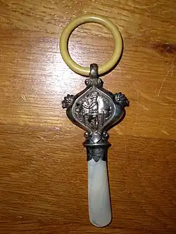 Les jouets de dentition ont une longue histoire. En Angleterre, aux XVIIe et XIXe siècles, un corail signifiait un jouet de dentition en corail, en ivoire ou en os, souvent monté en argent comme la poignée d'un hochet[26]. Un conservateur de musée a suggéré que ces substances étaient utilisées comme « magie sympathique »[27] et que l'os de l'animal pourrait symboliser la force animale pour aider l'enfant à faire face à la douleur.