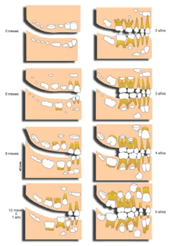 - ↑ Lunt Roger C., Law David B., « A review of the chronology of eruption of deciduous teeth », The Journal of the American Dental Association, vol. 89, no 4, , p. 872–879 (PMID 4609369, DOI 10.14219/jada.archive.1974.0484)