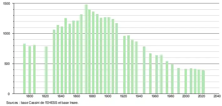 L'évolution du nombre d'habitants est connue à travers les recensements de la population effectués dans la commune depuis 1793. Pour les communes de moins de 10 000 habitants, une enquête de recensement portant sur toute la population est réalisée tous les cinq ans, les populations de référence des années intermédiaires étant quant à elles estimées par interpolation ou extrapolation[19]. Pour la commune, le premier recensement exhaustif entrant dans le cadre du nouveau dispositif a été réalisé en 2006[20].