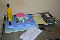 Un flacon de Bétadine dermique sur un plateau de soins dans un hôpital camerounais.