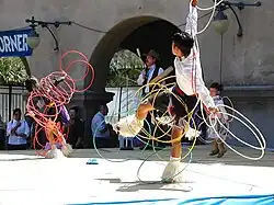 - Danse des cerceaux (Hoop Dance) : C'est une danse qui est habituellement pratiquée en solo, et qui peut être exécutée pour une démonstration, ou dans le cadre d'une compétition. Alors qu'il danse sans s'arrêter, d'un pas s'accordant au rythme de la musique, le danseur exécute des positions et des formes avec des cerceaux, racontant ainsi une histoire. Les transitions entre ses positions doivent être rapides et fluides, et peuvent contenir des manipulations agiles des cerceaux. Il peut utiliser un seul cerceau, comme il peut en utiliser plusieurs dizaines. Les symboles représentés pendant la danse réfèrent souvent à la nature et aux animaux, et le cerceau lui-même est le symbole du cercle, très présent dans la culture amérindienne, qui représente le cycle de la vie. Dans la tradition orale amérindienne, certains attribuent l'origine de cette danse à la nation Anishinaabe, alors que d'autres l'attribuent à la nation Pueblo. Bien qu'au départ elle était exécutée seulement par des hommes, les femmes sont entrées comme participantes dans les compétitions de danse de cerceaux vers la fin du XXe siècle, et il est fréquent de nos jours de voir des femmes exécuter cette danse.