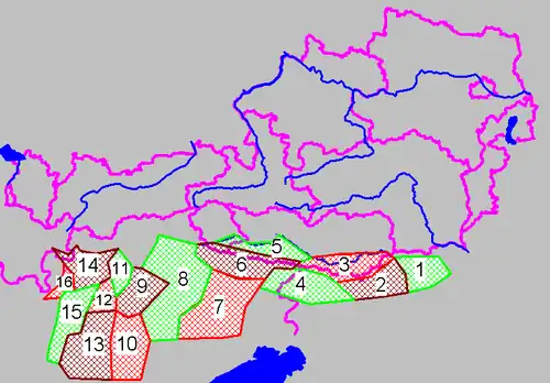 (en rose, les frontières des Lands autrichiens et des pays frontaliers).