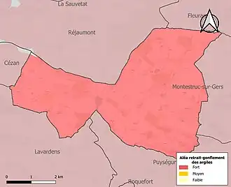 Le retrait-gonflement des sols argileux est susceptible d'engendrer des dommages importants aux bâtiments en cas d’alternance de périodes de sécheresse et de pluie. 99,9 % de la superficie communale est en aléa moyen ou fort (94,5 % au niveau départemental et 48,5 % au niveau national). Sur les 86 bâtiments dénombrés sur la commune en 2019, 86 sont en aléa moyen ou fort, soit 100 %, à comparer aux 93 % au niveau départemental et 54 % au niveau national. Une cartographie de l'exposition du territoire national au retrait gonflement des sols argileux est disponible sur le site du BRGM[18],[Carte 3].