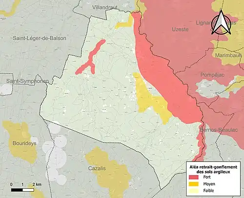 Le retrait-gonflement des sols argileux est susceptible d'engendrer des dommages importants aux bâtiments en cas d’alternance de périodes de sécheresse et de pluie. 23,9 % de la superficie communale est en aléa moyen ou fort (67,4 % au niveau départemental et 48,5 % au niveau national). Sur les 613 bâtiments dénombrés sur la commune en 2019, 340 sont en aléa moyen ou fort, soit 55 %, à comparer aux 84 % au niveau départemental et 54 % au niveau national. Une cartographie de l'exposition du territoire national au retrait gonflement des sols argileux est disponible sur le site du BRGM[28],[Carte 2].