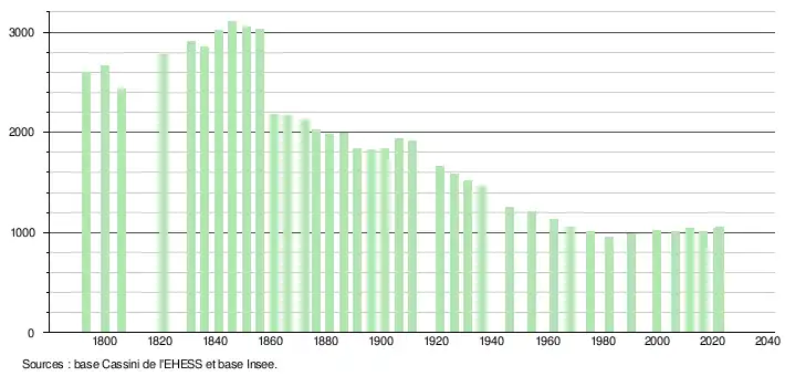 | L'évolution du nombre d'habitants est connue à travers les recensements de la population effectués dans la commune depuis 1793. Pour les communes de moins de 10 000 habitants, une enquête de recensement portant sur toute la population est réalisée tous les cinq ans, les populations de référence des années intermédiaires étant quant à elles estimées par interpolation ou extrapolation[39]. Pour la commune, le premier recensement exhaustif entrant dans le cadre du nouveau dispositif a été réalisé en 2006[40]. En 2022, la commune comptait 1 059 habitants[Note 1], en évolution de +4,64 % par rapport à 2016 (Gironde : +6,91 %, France hors Mayotte : +2,11 %). |