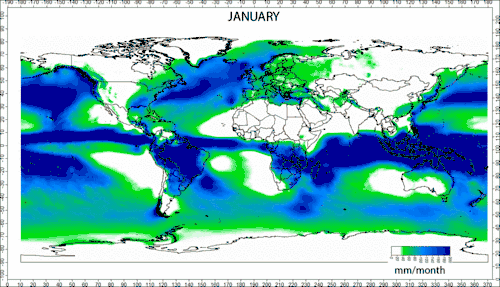 Les précipitations se forment et tombent aussi en mer. Les océans, en raison de leur superficie, reçoivent plus de précipitations que la terre[16]. Ils stockent environ 97 % de l'eau de la Terre et fournissent la grande majorité de l'eau évaporée qui entre dans le cycle de l'eau. Des changements importants pourraient avoir un impact sur la disponibilité de l'eau, la demande en eau et l'allocation de l'eau aux niveaux mondial et local[17].