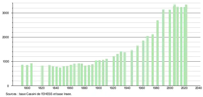 L'évolution du nombre d'habitants est connue à travers les recensements de la population effectués dans la commune depuis 1793. Pour les communes de moins de 10 000 habitants, une enquête de recensement portant sur toute la population est réalisée tous les cinq ans, les populations de référence des années intermédiaires étant quant à elles estimées par interpolation ou extrapolation[39]. Pour la commune, le premier recensement exhaustif entrant dans le cadre du nouveau dispositif a été réalisé en 2005[40].