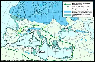 En archéologie, la période du Paléolithique correspond à l'époque géologique du Pléistocène, c'est-à-dire une période marquée cycliquement par des glaciations. Elle débute il y a 1,8 million d'années[D], pour se terminer autour de 10000 av. J.-C.. Pendant cette période, le climat se caractérise par des cycles de glaciations au cours desquels les calottes glaciaires s'étendent du pôle jusqu’aux environs du 40e parallèle nord. Près du tiers de la surface de la terre est recouvert d’inlandsis. Ceux-ci mobilisent une telle quantité d’eau que le niveau des mers baisse de 100 à 120 m, découvrant les plateaux océaniques, exondant ainsi des isthmes entre les îles et les continents. La Méditerranée orientale ne communique avec la Méditerranée occidentale que par un mince détroit qui sépare la Tunisie de la péninsule sicilo-maltaise[10],[11].